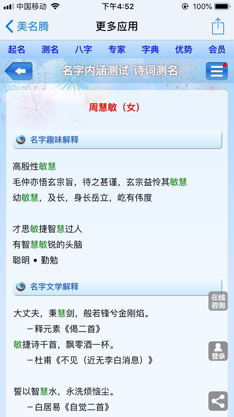 對于普通人來說,想要短時間想到這么多文化素材不是易事。但大家都希望讓自己的名字解釋出來比較有內(nèi)涵,那怎么辦呢?美名騰借助大數(shù)據(jù)技術(shù),給大家?guī)硇彰麅?nèi)涵測試分析工具,可以從多個維度分析測試名字的文化內(nèi)涵。這個工具免費(fèi)開放給需要起名、測名的朋友使用。為了方便大家使用,手機(jī)電腦都可以用。手機(jī)版內(nèi)涵測試地址:https://m.meimingteng.com/m/qujiemingzi.aspx 電腦版姓名內(nèi)涵測試地址:http://berryntransitrentals.com/Tool/Poem.aspx http://berryntransitrentals.com/Tool/Idiom.aspx