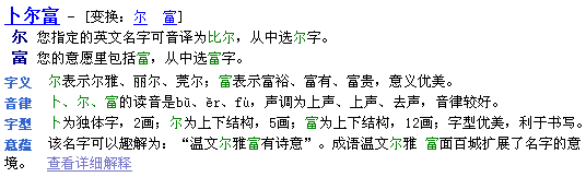 2. 點(diǎn)擊“提交”按鈕,系統(tǒng)即可為您起出符合要求的名字。以下是名字“卜爾富”的解釋信息。