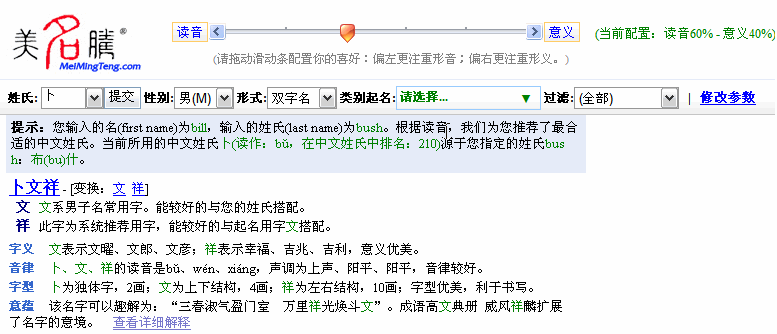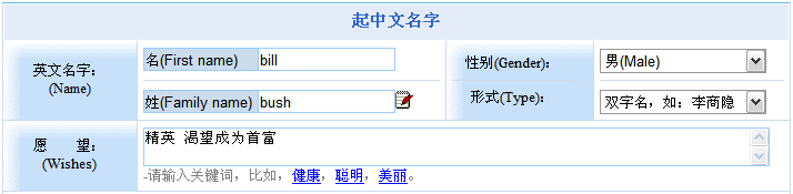 下圖顯示了使用美名騰老外起名系統(tǒng)為名為“bill”,姓為“bush”的老外起出的中文名。 |