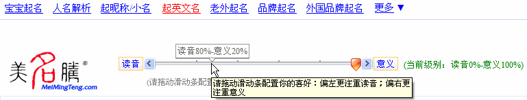 這兩種起名法,您完全可以得兼。使用美名騰起英文名系統(tǒng)提供的讀音、意義配置工具,您可以在讀音與意義之間尋找一個(gè)合適的平衡點(diǎn)以獲得滿意的英文名。如下圖所示。 |