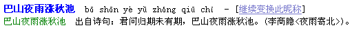 2. 點擊“提交”按鈕,系統(tǒng)即可為您起出符合要求的名字。以下是名字“巴山夜雨漲秋池”的解釋信息。