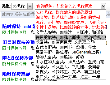 在網(wǎng)絡江湖上行走,擁有一個酷的昵稱,會增加不少點擊率。但是起個好昵稱并不是一件容易的事情,因為好的昵稱背后往往透射著智慧和格調(diào)。美名騰起昵稱系統(tǒng)能夠讓您輕松起出超酷昵稱。起昵稱時,建議您輸入全部信息,這樣美名騰起昵稱系統(tǒng)就可以根據(jù)您的信息起出與您最貼切的昵稱。此外,您還可以根據(jù)喜好,對昵稱的嚴謹和詼諧程度進行控制。下面兩幅圖分別顯示了使用類別起昵稱及控制嚴謹、詼諧程度的過程。