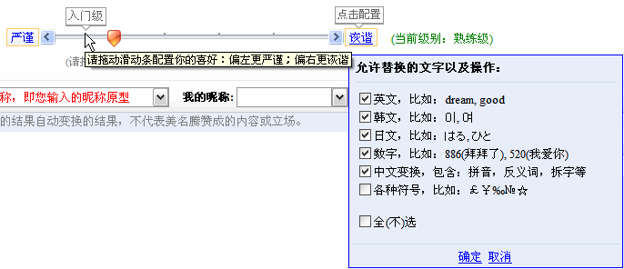 - 起昵稱系統(tǒng)創(chuàng)造性地將嚴謹與詼諧兩種起昵稱風格進行了有機融合。用戶可以拖動滑動條以配置嚴謹與詼諧這兩種風格的平衡。
