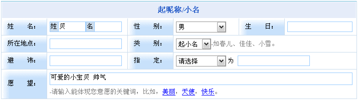 1. 在輸入信息中將姓氏填上,并在愿望中輸入“可愛的小寶貝 帥氣”。如下圖所示。